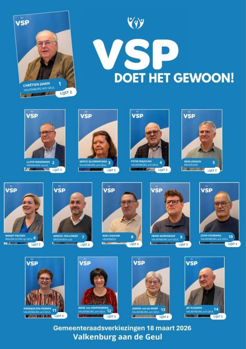 Gisteravond heeft de ledenvergadering van de VSP het concept verkiezingsprogramma en de kandidatenlijst vastgesteld voor de komende gemeenteraadsverkiezingen van 18 maart as. voor Valkenburg a/d Geul. Er staan 14 kandidaten op de lijst die er volop tegenaan gaan om de VSP de grootste partij van Valkenburg a/d Geul te laten worden. Daar heeft de VSP ook keihard voor geknokt de afgelopen 4 jaar. Waarom een concept verkiezingsprogramma. Ons verkiezingsprogramma is zo goed als rond. Alleen gaan wij nog de komende weken inwoners benaderen hoe zij hierover denken en nog aanvullende punten hebben die wij nog in het verkiezingsprogramma willen opnemen. Zo staan wij o.a. bij de Plus in Berg op 23 januari as. van 10 uur tot 12 uur. Bij de ALDI in Broekhem op 30 januari as. van 10 uur tot 12 uur. Bij de JUMBO in Valkenburg op 6 februari as. van 10 uur tot 12 uur. Bij de AH 20 februari as. van 10 uur tot 12 uur. Het concept verkiezingsprogramma vind u onder het hoofdstuk "Ons Programma".